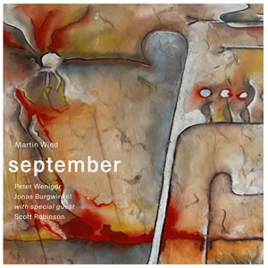 September - Laika Records - "September serves as a continuation in a long and inventive line of Wind releases on the Laika label. The Bremen-based imprint has been home to numerous projects from the bassist: a showcase for his New York Bass Quartet; a meeting with the JazzBaltica Jubilee Ensemble; co-led sessions with guitarist (and fellow Flensburg, Germany native) Ulf Meyer; summits with American heavies and European bigwigs (respectively, usually); and, pertinent to this piece, statements from his forward-thinking Gravity trio, with tenor saxophonist Peter Weniger and drummer Jonas Burgwinkel."