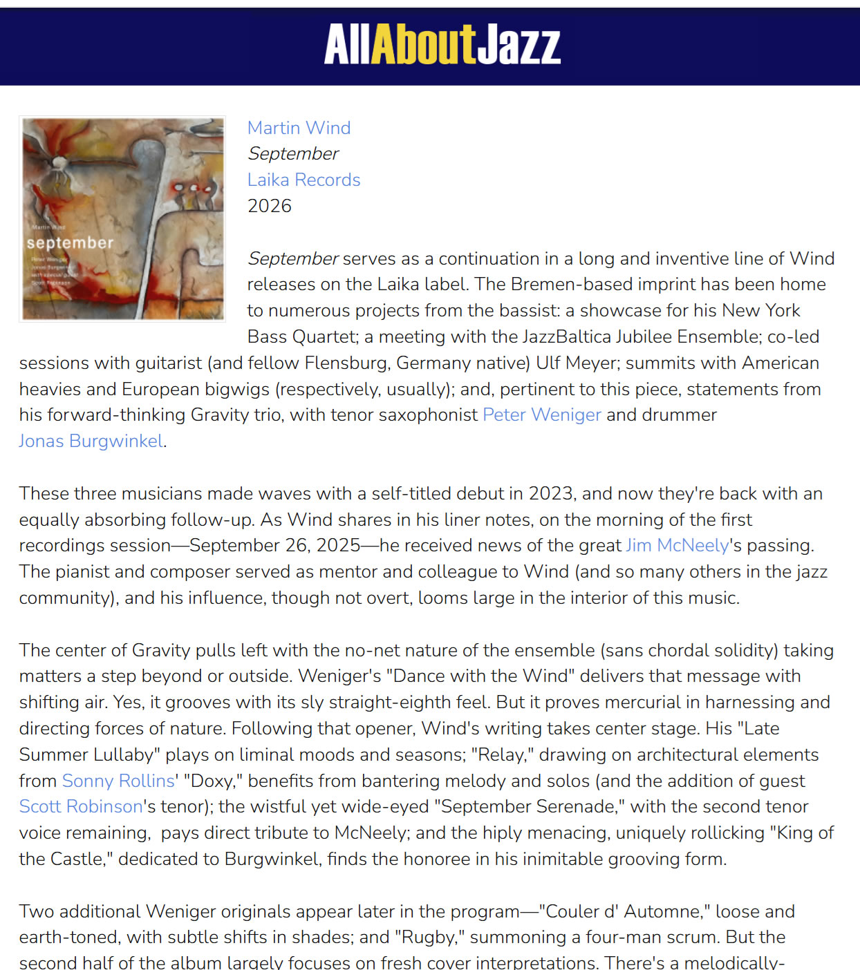 September serves as a continuation in a long and inventive line of Wind releases on the Laika label. The Bremen-based imprint has been home to numerous projects from the bassist: a showcase for his New York Bass Quartet; a meeting with the JazzBaltica Jubilee Ensemble; co-led sessions with guitarist (and fellow Flensburg, Germany native) Ulf Meyer; summits with American heavies and European bigwigs (respectively, usually); and, pertinent to this piece, statements from his forward-thinking Gravity trio, with tenor saxophonist Peter Weniger and drummer Jonas Burgwinkel. - Read the full review on All About Jazz By Dan Bilawsky, February 5, 2026
